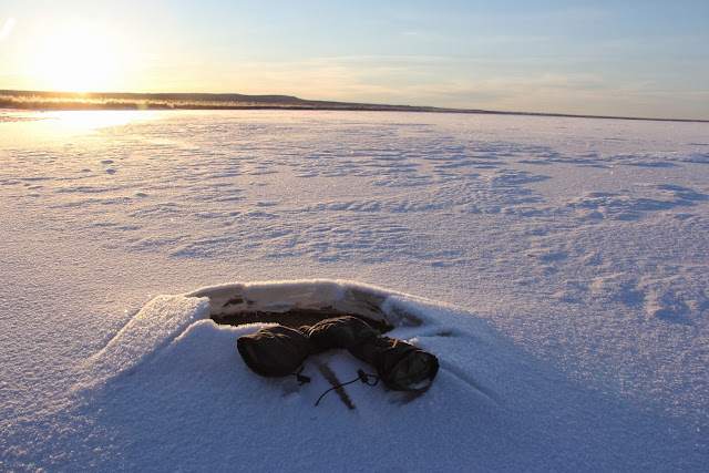 After parking I packed up some gear to potentially cross the lake and started down the cut which is obviously a winter trail only and looks suspiciously line an overgrown seismic line. The cut leads to a rough cabin by the shore of the lake; which is well down, if the wide shore is any indication, and well frozen at this location, about 10cm thick. A slight wind from the north on the lake and very high humidity; I could feel the cold even though it was only a -20 air temp. It was an easy walk over to the base of the cliffs. Ok rock, not as nice as the bluff I have been working on but definitely climbable. The steepest and longest section is a full 60m rope stretcher to the top. This part could easily be developed and gets good sun. Took some pix and put crampons on to head north along the base and check for possible crossing points. With the slight wind and extremely high humidity the cold became noticeable. Found open water on new, thin ice and no secure crossing options. Ice was cracking under my weight and making sounds day as the sheet was flexing under the varying thermal conditions and wind action. I headed back and sheltered by the cliff out of the wind and above the lake –big difference in thermal retention.